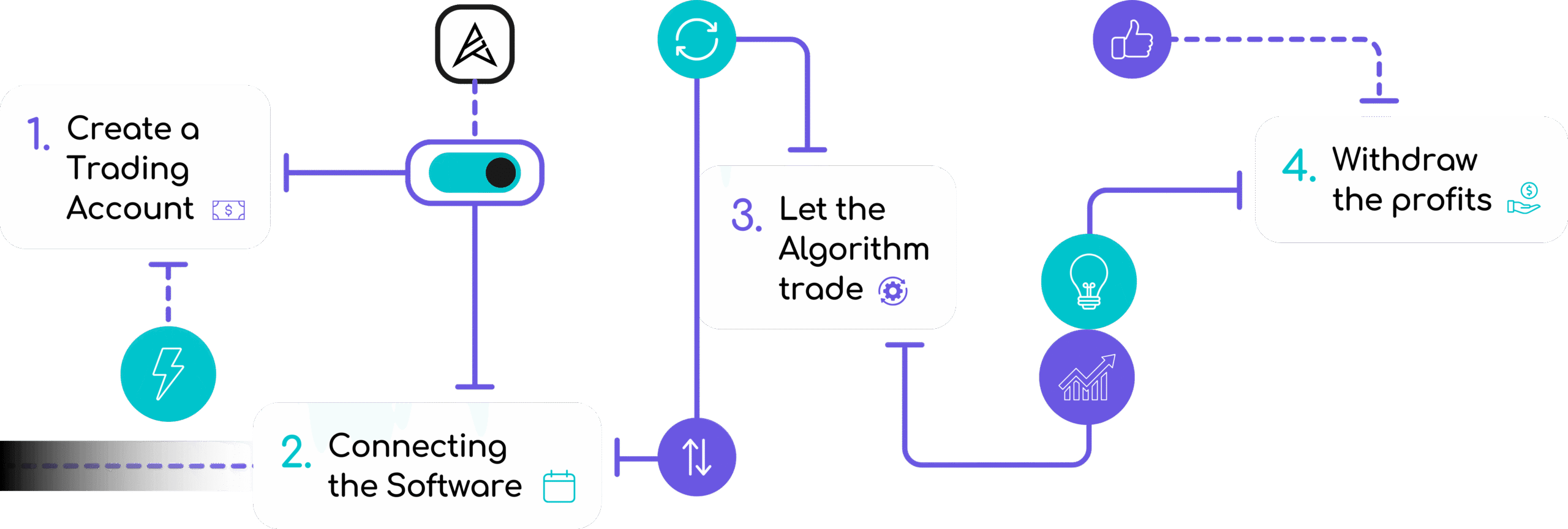 Our algorithm does the trading for you, saving you time. It analyzes the market, spots trends, and makes trading decisions. It's fully automated, so no emotional decisions are made. It adapts to the market, and you can expect up to 5% monthly returns. It’s also easy to use, so you don’t need prior experience.